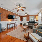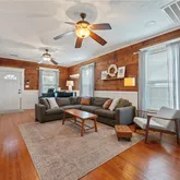 Step inside to warm wood walls framed by waiscotting and rich hardwood floors create a cozy, inviting space full of character. The living room blends historic style with everyday comfort, featuring beautiful natural textures, tall windows for natural light, and plenty of room to gather with family or friends.