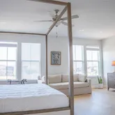 Expansive owner’s suite with a private sitting area and serene pond views