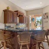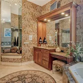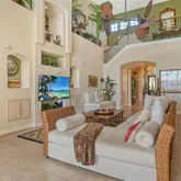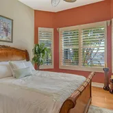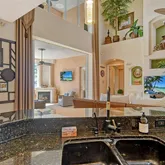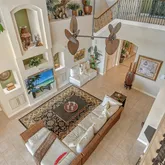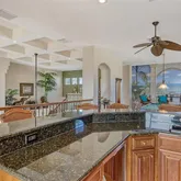- Interior Features: Cathedral Ceiling(s), Ceiling Fan(s), Coffered Ceiling(s), Eating Space In Kitchen, High Ceilings, Kitchen/Family Room Combo, Open Floorplan, Pest Guard System, Primary Bedroom Main Floor, Solid Surface Counters, Solid Wood Cabinets, Thermostat, Tray Ceiling(s), Vaulted Ceiling(s), Walk-In Closet(s), Wet Bar, Window Treatments