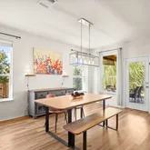 The bright and airy living area is filled with natural light, creating a chic and welcoming atmosphere. Your living room opens seamlessly into your gourmet kitchen. The kitchen is a chef’s delight, offering ample counter space, high-quality finishes, and a seamless flow for entertaining. Your stunning kitchen provides an abundance of counter and cabinet space. You have a peninsula counter and a breakfast bar with wood accents. A stylish tile backsplash, sile stone countertops, stainless steel appliances, a gas cooktop stove, a built-in microwave, and a breakfast area. French doors lead you to a dedicated office space with industrial-style shelves.