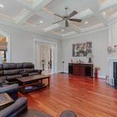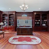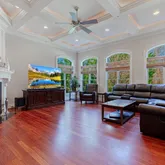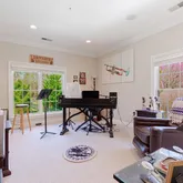 Continue past the living room and you will be drawn to the stunning wood-paneled office. The warm and inviting space features floor-to-ceiling custom wood paneling, creating a sense of sophistication and elegance that is sure to impress.