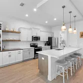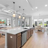 - Interior Features: Ceiling Fan(s), Coffered Ceiling(s), Crown Molding, Eating Space In Kitchen, High Ceilings, Kitchen/Family Room Combo, Open Floorplan, Primary Bedroom Main Floor, Solid Surface Counters, Solid Wood Cabinets, Split Bedroom, Stone Counters, Thermostat, Walk-In Closet(s), Window Treatments