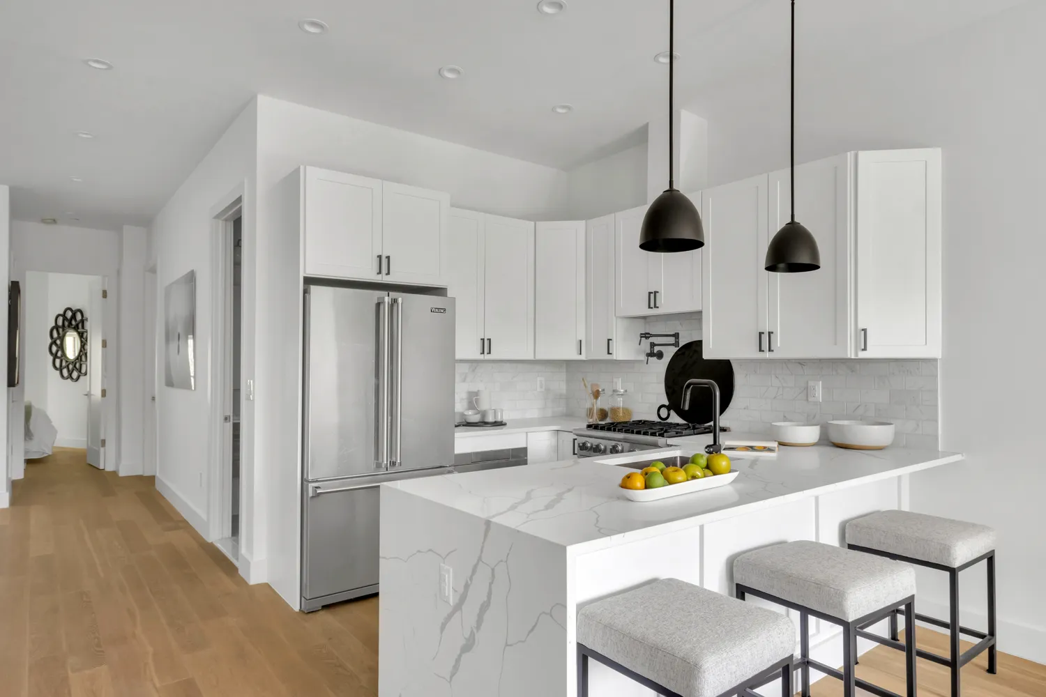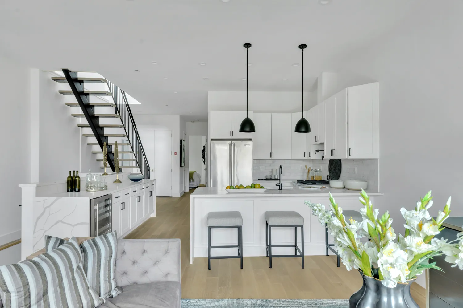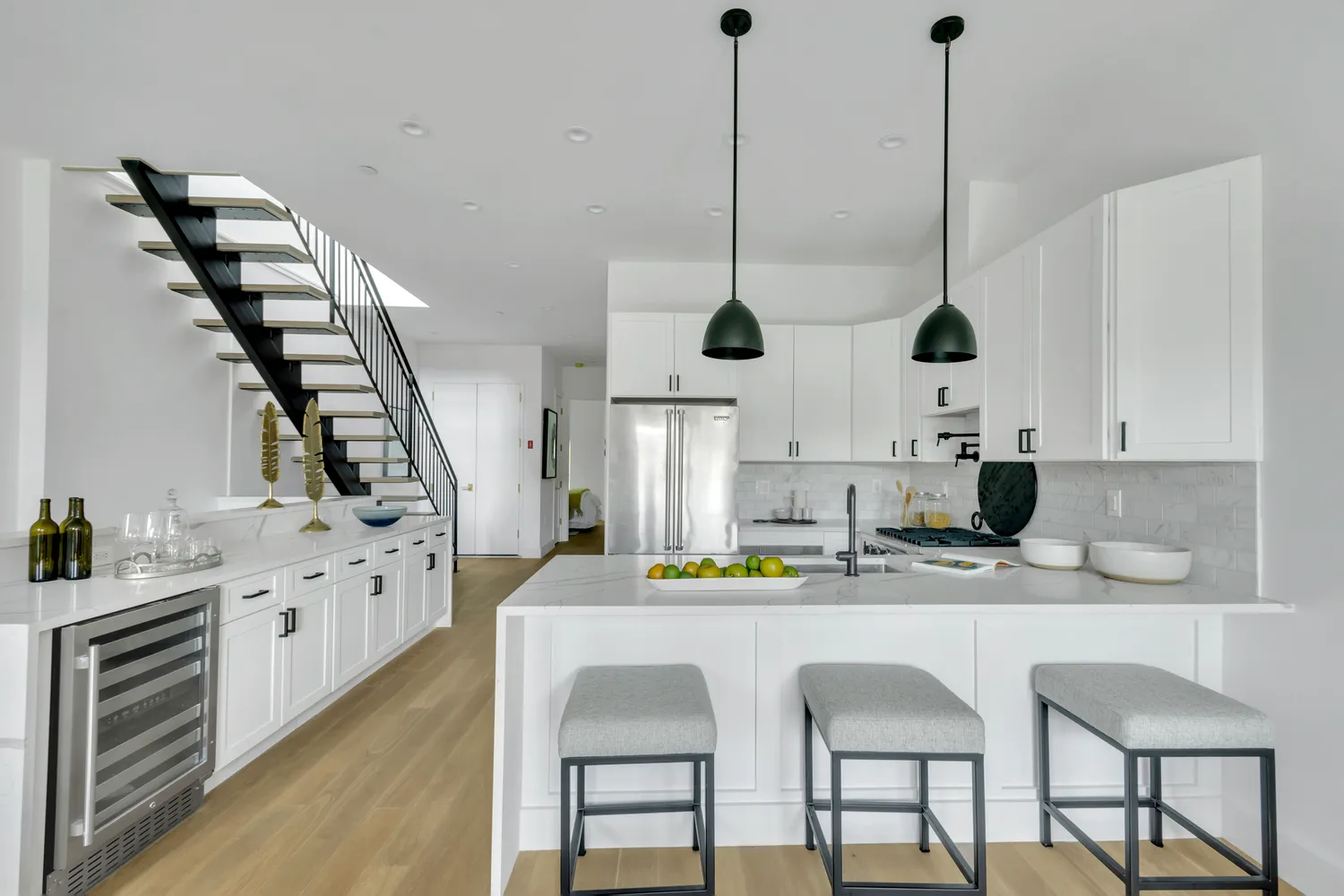 Custom designed buffet with Calacatta quartz, separate Fridge and wine cooler. Perfect for Buffet dining. Wide plant Siberian White Oak flooring complete with radiate heating throughout. Extensive and abundant Recessed lighting adorn the space completely.