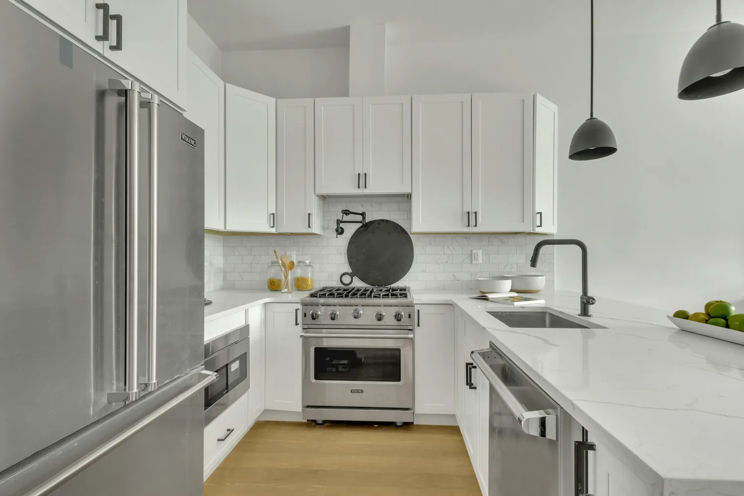 Enter to this Beautifully designed Open Concept floor plan that combines Modern, Classic understated Elegance. Incredible Ceiling Height with Floor to Ceiling windows that allows to flood amazing Natural sunlight. Exquisitely Designed Custom Chef's Kitchen featuring Calacatta quartz Counters, Huge Breakfast Bar, Viking Professional Stainless appliances accented with Black Grohe Fixtures and pot Filler.