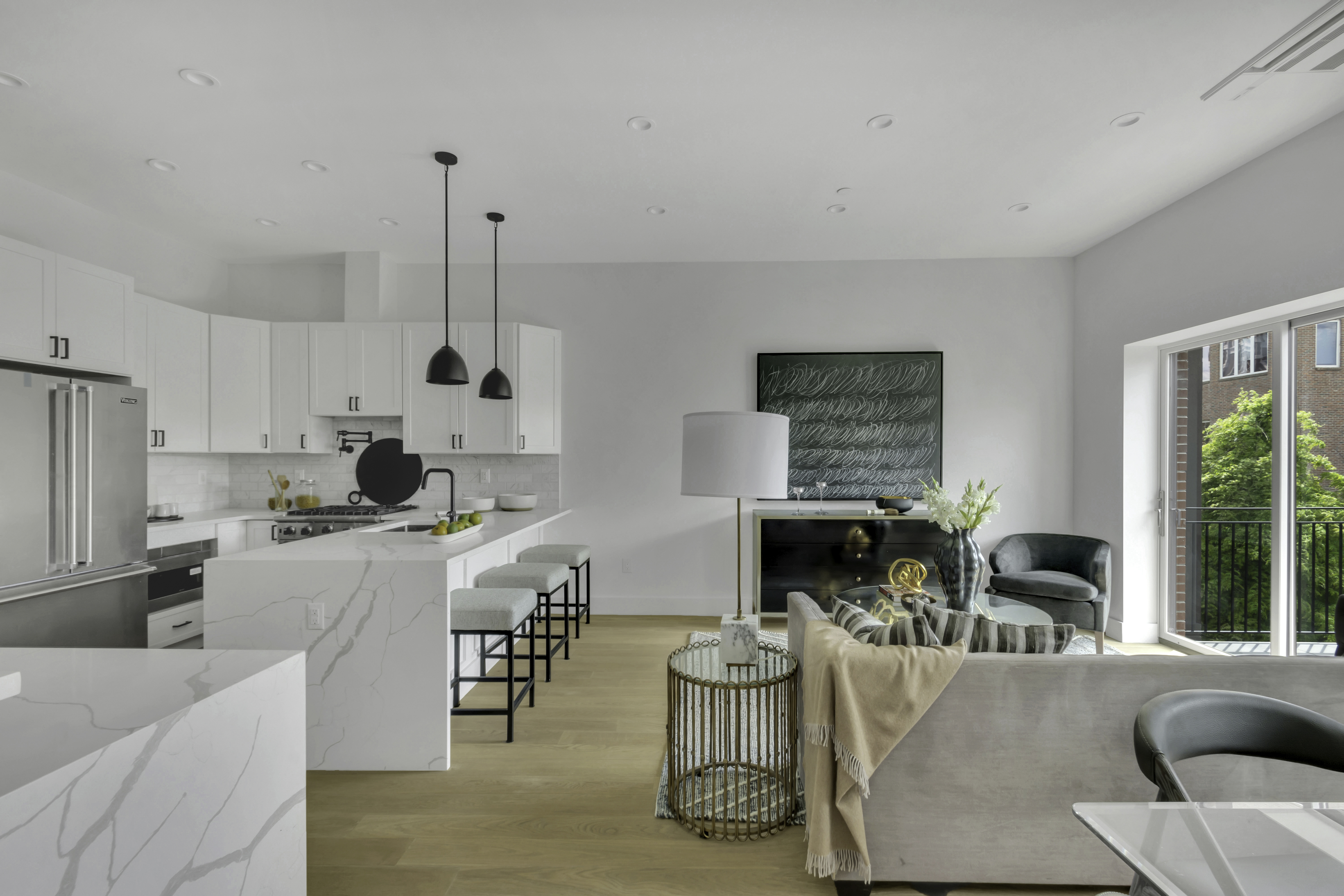 Enter to this Beautifully designed Open Concept floor plan that combines Modern, Classic understated Elegance. Incredible Ceiling Height with Floor to Ceiling windows that allows to flood amazing Natural sunlight. Exquisitely Designed Custom Chef's Kitchen featuring Calacatta quartz Counters, Huge Breakfast Bar, Viking Professional Stainless appliances accented with Black Grohe Fixtures and pot Filler.