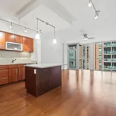 Welcome to The Velocity — a spacious one-bedroom plus separate den with a private balcony in the extremely popular Navy Yard neighborhood of Washington, D.C. This interior, north-facing unit features floor-to-ceiling windows that provide steady, natural daylight without harsh glare. The open layout connects the kitchen, dining, and living areas in a comfortable, functional way, with hardwood floors throughout. The kitchen includes stainless steel appliances, quartz countertops, and an island with seating. The den offers flexibility for a home office, guest space, or reading area and includes its own closet and ceiling fan. The primary bedroom features a tray ceiling, a walk-in closet, and a separate built-in armoire, providing excellent storage options. The bathroom is modern and well-sized, with ample counter space, storage, and a walk-in shower with a built-in bench. In-unit washer and dryer included.