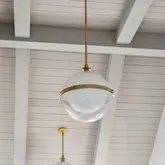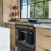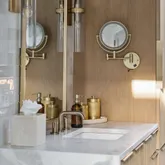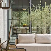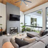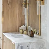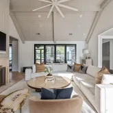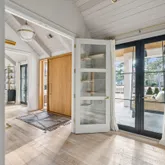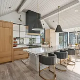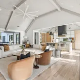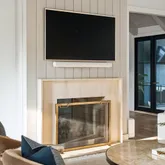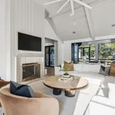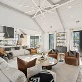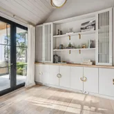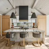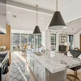At the heart of the home, the kitchen stands as a true showpiece, anchored by fully custom white oak cabinetry, a statement Italian range with double ovens, and top-of-the-line appliances. Dover White marble countertops waterfall over the ledge of the island with a thick mitered edge to create a seamless silhouette, while timeless unlacquered brass finishes add warmth and patina. The kitchen opens to a large family room designed for entertaining, with built-in speakers throughout and accordion doors that flow effortlessly to the spacious screened porch, inviting in coastal breezes on cooler days.