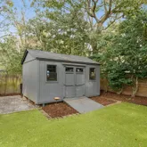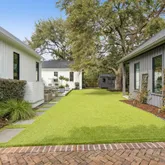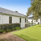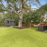 The backyard is framed by a six-foot privacy fence, mature landscaping, and artificial turf for effortless maintenance. Olive trees, magnolia, camellia, jasmine, and layered native plantings create a lush, private sanctuary, complemented by raised garden beds for the garden enthusiast. A large storage shed keeps beach chairs and outdoor gear organized, and the attached carport is perfectly positioned for golf cart parking, a thoughtful Lowcountry luxury.
