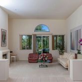 - Supplement: The cultivated aesthetic of designer Rod Sidall is in evidence from the moment you step through the exquisite double entry doors with zinc caming and custom glass transom and sidelights into the pristine, white tile entry. Just beyond is the formal living room, Plush- soft white carpeting and fireplace make the space warm and inviting. The serene ambiance is mirrored in the adjacent formal dining room. Enjoy elegant meals open to the surrounding patio and splendid views of the hills by day and lights by night. The family room and open kitchen form one great space in which to live and entertain. Another fireplace makes this spacious room cozy. The galley kitchen is well-equipped for cooking and entertaining in style, with abundant wood cabinetry with inset lighting; modern, built-in stainless appliances including double-door refrigerator, oven, microwave, dishwasher and compactor; and granite countertops extending to a bonus bar with seating for two. The breakfast nook is set in a sunny corner surrounded by windows. Step outside through the sliding doors to serve guests on the patio. The 750 sq. ft. master suite is exquisitely appointed with vaulted ceilings, corner fireplace and walk-in closet with build-ins. Begin your day with coffee or breakfast on your private patio. A luxurious bath awaits with travertine tile floors, his and hers sinks with generous counters and cabinetry, glass-enclosed shower and French self-closing toilet. From the raised soaking tub, enjoy the warmth of the sun or the sparkle of starlight through the surrounding windows and overhead skylight. Outside, the panoramic views of the surrounding hills will take your breath away as you step from the covered patio to a charming walkway that leads to the sparkling in-ground pool and spa. The beautifully designed estate continues down the hillside with strategically-placed palms dotting the landscape, culminating in a private putting green and corrals. In addition to the home’s attached 3-car garage and spacious paved drive is a detached 1,500 sq. ft. workshop/6-car-RV garage with guest house- perfect spot to house in-laws or long-term guests. Extras include central heat & air; natural gas; custom glass features; security alarms; and intercom within house, well on the property for landscape irrigation and between house and workshop. 1 year old irrigation well, cost $35,000