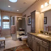 From the moment you step inside, soaring 24-foot ceilings and grand Palladian windows set the tone for a home built to impress. Every detail has been thoughtfully selected, from high-end finishes throughout to a show-stopping white quartz brick fireplace anchoring the Great Room. MAIN LEVEL HIGHLIGHTS The owner's suite offers a true retreat with a spacious bath, jacuzzi tub, walk-in closet, and easy main-level access. A generous guest room with its own full bath, a custom-designed office, formal dining room, and two half-baths round out the main floor. The gourmet kitchen is a centerpiece — featuring double ovens, an oversized refrigerator, abundant cabinetry, and a separate bar area with a built-in beverage fridge. OUTDOOR LIVING AT ITS FINEST