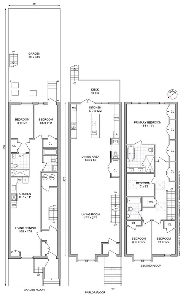Upon entering the owner's duplex you are welcomed by the herringbone-patterned white oak floors and abundant Eastern light creating an immediate sense of warmth and openness. The open-concept living and dining space is anchored by a showstopping kitchen, featuring quartz countertops, a large waterfall island, custom cabinetry, and top-of-the-line appliances: a six-burner Bosche gas stove, pot filler, integrated French Door Bosche refrigerator, Sharp microwave, Summit wine fridge, integrated Bosche dishwasher, and an oversized farmhouse sink. Full-glass double doors off the kitchen lead to the spacious parlor deck, perfect for entertaining or enjoying a quiet morning overlooking the Southfacing garden.