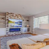 - Room Description: Custom floor to ceiling tile feature wall surrounding a stylish electric fireplace. Custom cabinets & open shelving on each side of fireplace. Huge picture window.