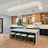 Inside, you’re greeted by soaring 10-foot ceilings, wide-plank hardwood floors, and a striking floating staircase. The main level features an open, light-filled living room that flows effortlessly into the dining area, ideal for both everyday living and entertaining. The chefs kitchen is a true centerpiece, complete with custom cabinetry, soft-close drawers, a waterfall quartz island, Sub-Zero and Wolf appliances, and a separate prep kitchen with an oversized pantry. A secondary main-level suite offers a full bath, walk-in closet, and bedroom, perfect for guests or multigenerational living. A gas fireplace anchors the family room, which opens to a rear deck, perfect for indoor-outdoor gatherings.