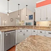 - Kitchen Features: Breakfast Bar, Breakfast Room, Cabinets White, Kitchen Island, Pantry, Stone Counters, View to Family Room