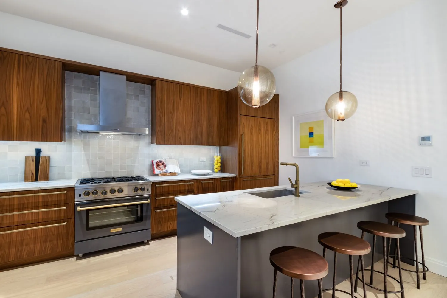 The gracious primary bedroom suite boasts a large walk-in closet and en-suite bath with Asian Statuary Marble tiles, double sinks and vanities, separate shower, Bosch toilet and Kohler soaking tub. There is also a spacious second bedroom on this level and second bath complete with Asian Statuary Marble tiles, Bosch toilet and Kohler soaking tub.