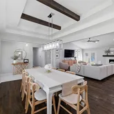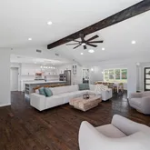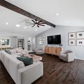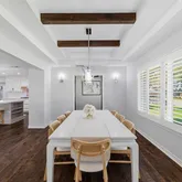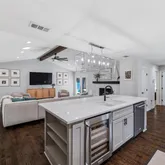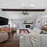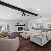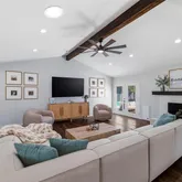 The gourmet chef’s kitchen...Welcome to this beautifully updated, move-in ready home featuring a versatile and highly sought-after floor plan with 4 spacious bedrooms, 3 full bathrooms, a private home office, and multiple outdoor living spaces. Designed for both everyday living and effortless entertaining, the open-concept layout showcases a stunning vaulted ceiling with exposed beams, abundant natural light, and a living area pre-wired for surround sound—perfect for a true home theater experience.