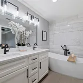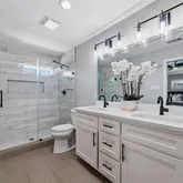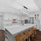 The gourmet chef’s kitchen is a standout, complete with an oversized quartz island, high-end stainless steel appliances, gas cooktop, wine refrigerator, and a stylish beverage bar—ideal for hosting. The expansive primary suite offers a serene retreat with a spa-inspired ensuite bath featuring quartz countertops, a freestanding soaking tub, oversized walk-in shower, and a generous walk-in closet.