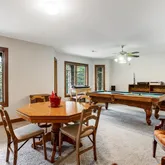 - Room Description: Large game room with pool table, custom millwork, large windows, adjacent to full wet bar w/custom cabinets and wine fridge; double french doors lead out to covered stone patio space.