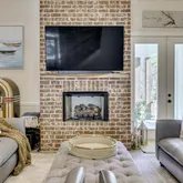 A stately brick and Hardie Board crowned by a durable composition roof. Landscaping blends manicured beds with natural greenery, while a rolling lawn stretches toward the shoreline. Outdoor living is elevated with a spacious covered porch - perfect for coffee at sunrise, grilling in the afternoon, or entertaining by twilight. A custom stone firepit with a generous seating area transforms evenings into unforgettable gatherings of stargazing, storytelling, s'mores, and lakeside relaxation. Interior Elegance