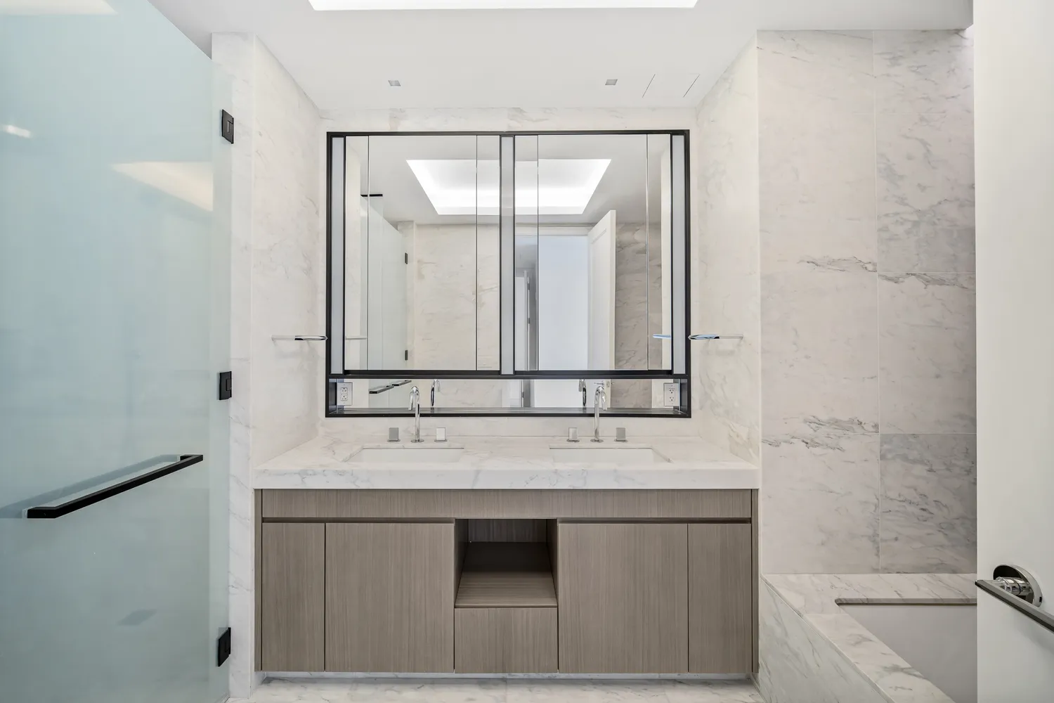 The primary suite is a private retreat, thoughtfully separated by its own vestibule. Oversized windows bring in natural light, while a large walk-in closet and spa-like en-suite bath elevate everyday living. The bathroom is finished in high-honed Calacatta Mandria marble with Fantini polished chrome fixtures, a custom vanity, and an oversized walk-in shower. A generously sized second bedroom with its own en-suite bath, a statement powder room with sculptural Nero Marquina marble sink, and an in-unit washer and dryer complete the residence.