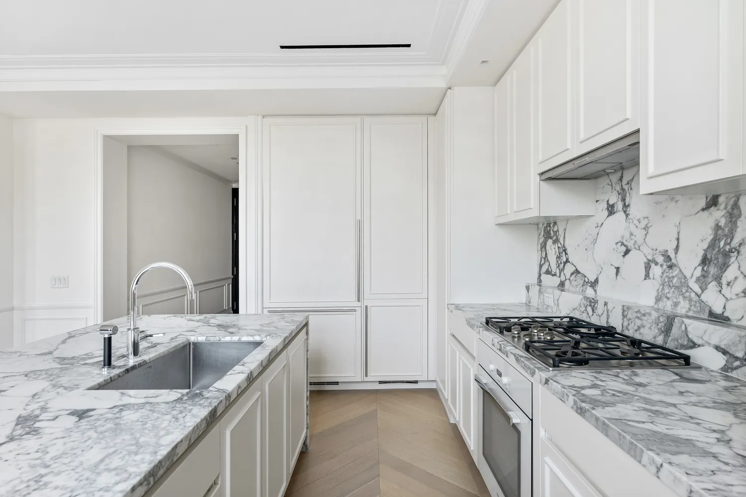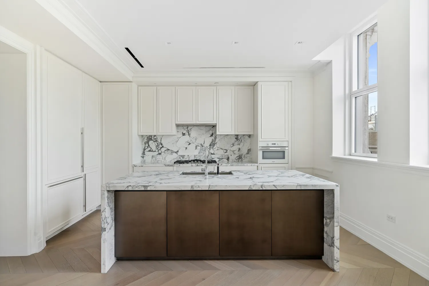 The open-concept kitchen, custom-designed by Jeffrey Beers International exclusively for 108 Leonard, features Scavolini cabinetry paired with Calacatta Vagli marble countertops, backsplash, and a waterfall island with ample storage. Outfitted for serious cooking and effortless hosting, the kitchen includes a full suite of premium Miele appliances, including a five-burner gas cooktop, steam and speed ovens, and a wine refrigerator.
