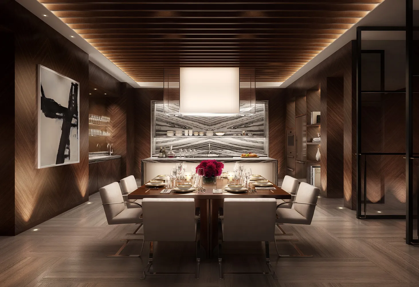 The home has gorgeous wide plank gray oak flooring arranged in a chevron pattern, Scavolini kitchen cabinetry with a massive Calacatta Vagli marble countertop, backsplash, and waterfall island replete with supplemental storage ideal for both everyday use and entertaining. The chef’s kitchen is outfitted with premium Miele appliances including a 5 burner gas cooktop, combi steam/convection oven, electric speed oven and wine refrigerator.