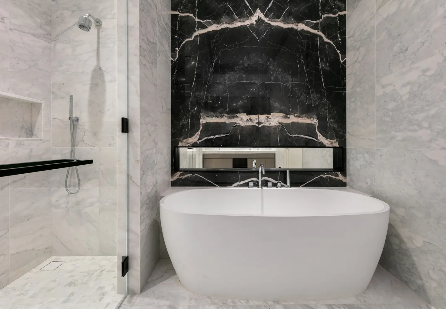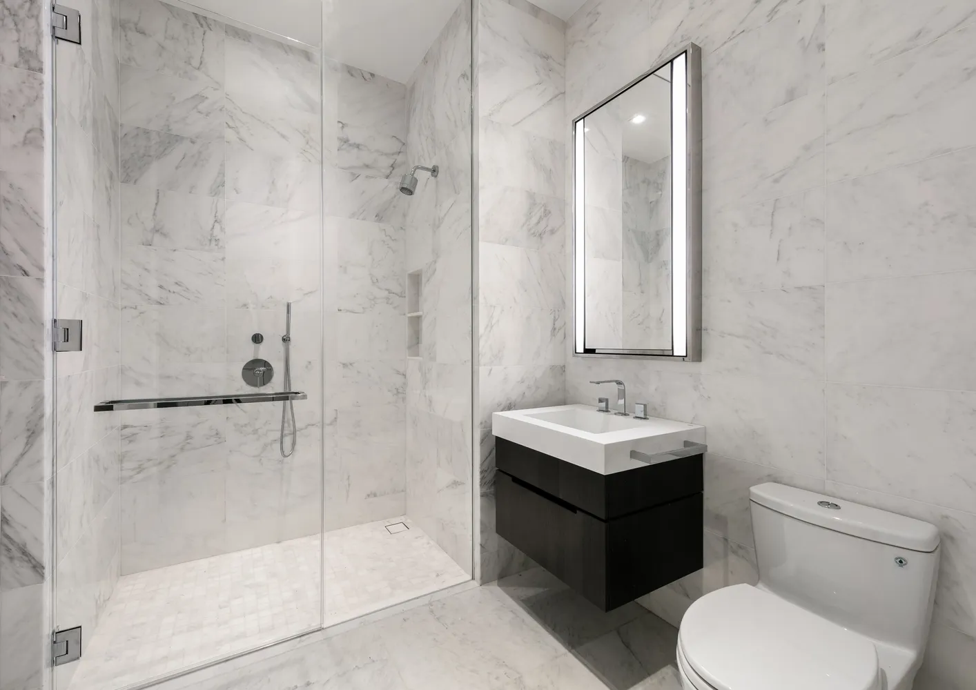 A distinct entry vestibule creates a sense of privacy and seclusion in a Master Suite with large windows, a walk-in closet and a luxurious en suite bathroom with high-honed Calacatta Mandria marble floors and walls. Fantini polished chrome fixtures compliment the custom vanity and an oversized walk-in shower.