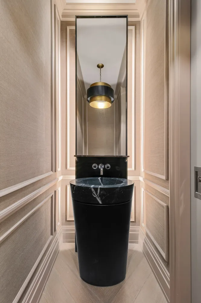 Two secondary bedrooms with en suite bath, a signature powder room with sculptural Nero Marquina marble sink and a utility closet with washer and dryer complete this home.
