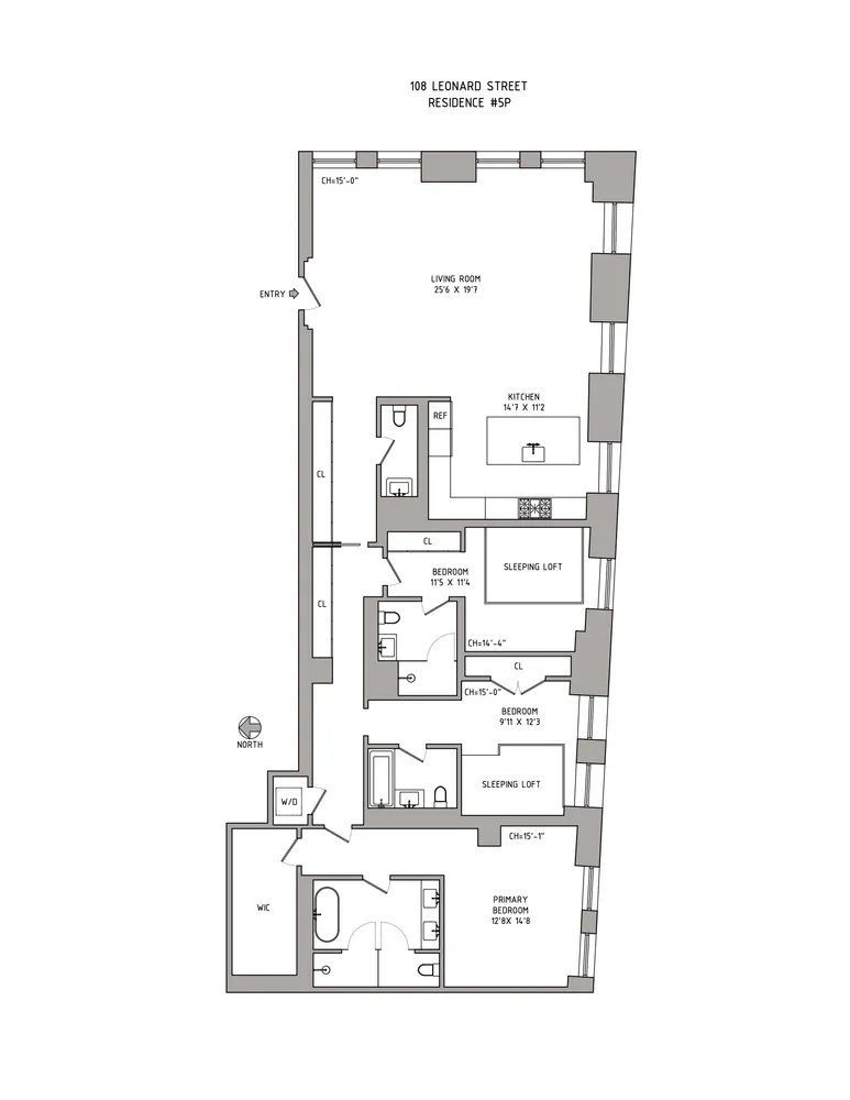 Residence 5P is an awesome 2448 square foot 3-bedroom, 3.5-bath residence featuring 15 foot ceilings and uncompromised scale, volume and character and is very different from the other P-line residences in the building. This home is significantly larger than the other P-lines in the building, is a corner unit with multiple exposures and most notably has dramatic 15+/- foot...Far and away the best available residence being offered and the best deal in this amazing Tribeca condominium at 108 Leonard.