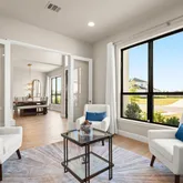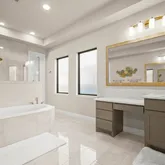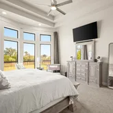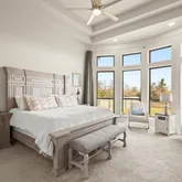 - Private primary retreat downstairs: curved wall of windows, spa bath with dual vanities, garden tub, frameless shower, and two enormous walk-in closets