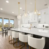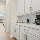 - Chef’s island kitchen: white shaker cabinetry, brass accents, 5-burner gas cooktop, double pantries (walk-in + butler’s)