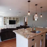 Step down into the sunken full kitchen with gorgeous granite countertops and tile backsplash and huge family room - great for entertaining! The family room features a wall of custom built-in storage. The kitchen offers double doors that lead to the huge deck overlooking the large fenced in backyard.