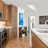 upgrades materially enhance how the home lives. The kitchen’s statement marble—paired with the warmth of herringbone oak—creates a cohesive, design-forward palette that transitions seamlessly into the window-lined living and dining zones. Everyday convenience and thoughtful