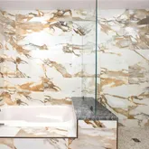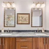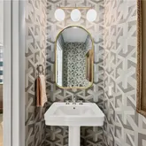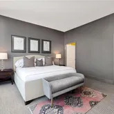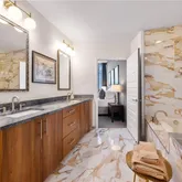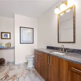 The split bedroom plan maximizes privacy. The serene primary suite features a custom California Closets system and a spa-quality bath appointed with natural quartzite counters, upgraded faucets and shower hardware, and a custom-height low-iron glass shower enclosure for crisp clarity. The gracious secondary bedroom is ensuite and enjoys a professionally sound-proofed wall—ideal for rest, work, or media. A chic powder room with pedestal sink serves guests with style. Throughout the residence, details are thoughtfully refined: taller upgraded baseboards, tile flooring in all baths, custom mirrors, and designer lighting that carries through halls and living spaces.