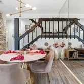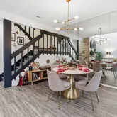 - Room Description: The formal dining area sits under a sleek, modern chandelier and alongside a mirrored wall that adds incredible depth of space; Open to the living room