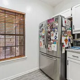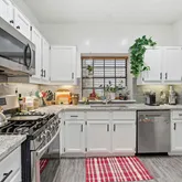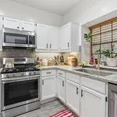 - Room Description: The kitchen is upgraded with desirable modern finishes including stainless steel appliances, granite countertops, subway tile backsplash, and white, under-lit cabinetry with modern pulls; Convenient built-in pantry storage plus a large window; Appliances all included