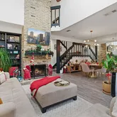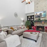 - Room Description: Stunning living room under two story high ceilings open to the second floor living area upstairs and stacked windows; A striking fireplace serves as the focal centerpiece with a floor-to-ceiling brick hearth and adjacent built-ins for books and decor; Open to the dining area for seamless connectivity