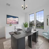 The main level features a serene primary suite with a spacious bathroom offering dual vanities and a large shower and closet. A second bedroom on the main floor has its own en suite bath ideal for guests or multigenerational living. A sun-filled home office at the front of the house offers a peaceful space to work or create, and the dedicated media room with built-in cabinetry is perfect for movie nights or entertaining.