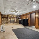 - Fireplace Features: Blower Fan, Decorative, Glass Doors, Stone, Wood Burning