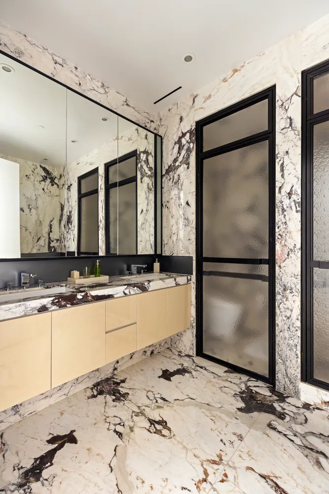 Downstairs is the spa level, a serene oasis whose epicenter is the 35-foot stainless steel pool. Hardly an afterthought, the quality of finish matches the excellence found in the upper floors, with 360 degrees of imported stone, a steam room with rain shower, a dry sauna, a powder room and multiple zones for relaxing or exercising.