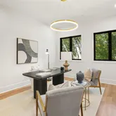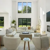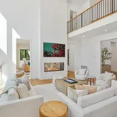 The dramatic entry hall, crowned by a 21-foot ceiling and anchored by a Venetian plaster fireplace, introduces interiors of remarkable light and proportion. Expansive Marvin windows frame the verdant vistas, while wide-plank white oak floors and refined architectural detailing lend a sense of understated sophistication throughout.