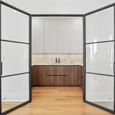At the heart of the home, the kitchen showcases DOCA cabinetry imported from Spain, professional-grade Wolf and Sub-Zero appliances, and a full scullery enclosed by steel-and-glass doors. A butler’s pantry and bespoke dining room cabinetry further elevate the entertaining experience.