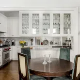 Accessed via an internal staircase, these beautifully restored duplexes sit opposite one another on the top two floors of the townhouse. Each residence features three bedrooms, original 100-year-old hardwood floors, and an active wood-burning fireplace. The front apartment offers three bedrooms and two-and-a-half bathrooms, while the rear apartment provides three bedrooms and two full bathrooms. The first floor boasts a grandly scaled living/dining room with oversized windows, original crown moldings, and soaring 11-foot ceilings. Bright and modern, the kitchen overlooks the great room and is appointed with a suite of stainless-steel appliances, beautiful marble subway tiling, and a breakfast bar that comfortably seats four.