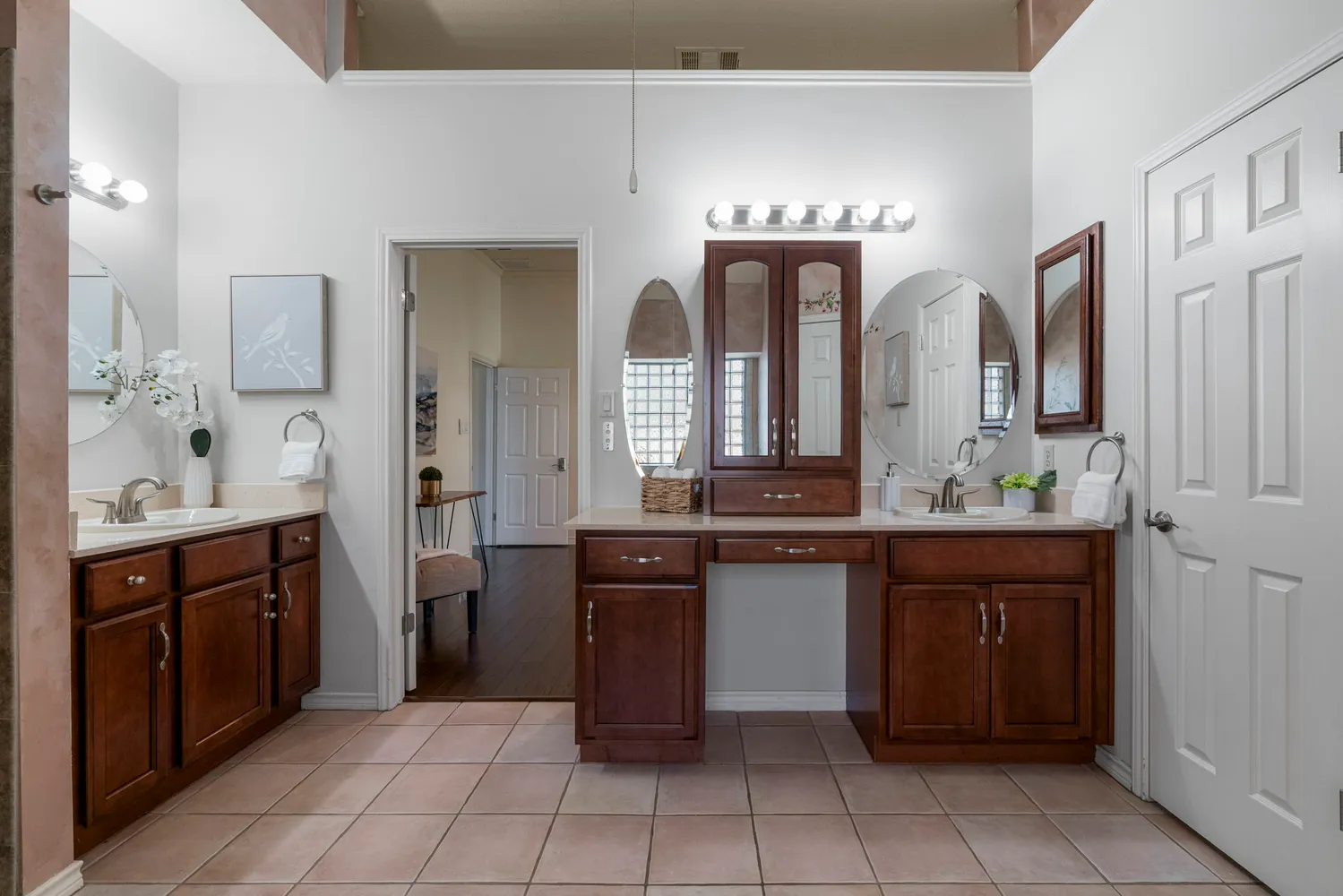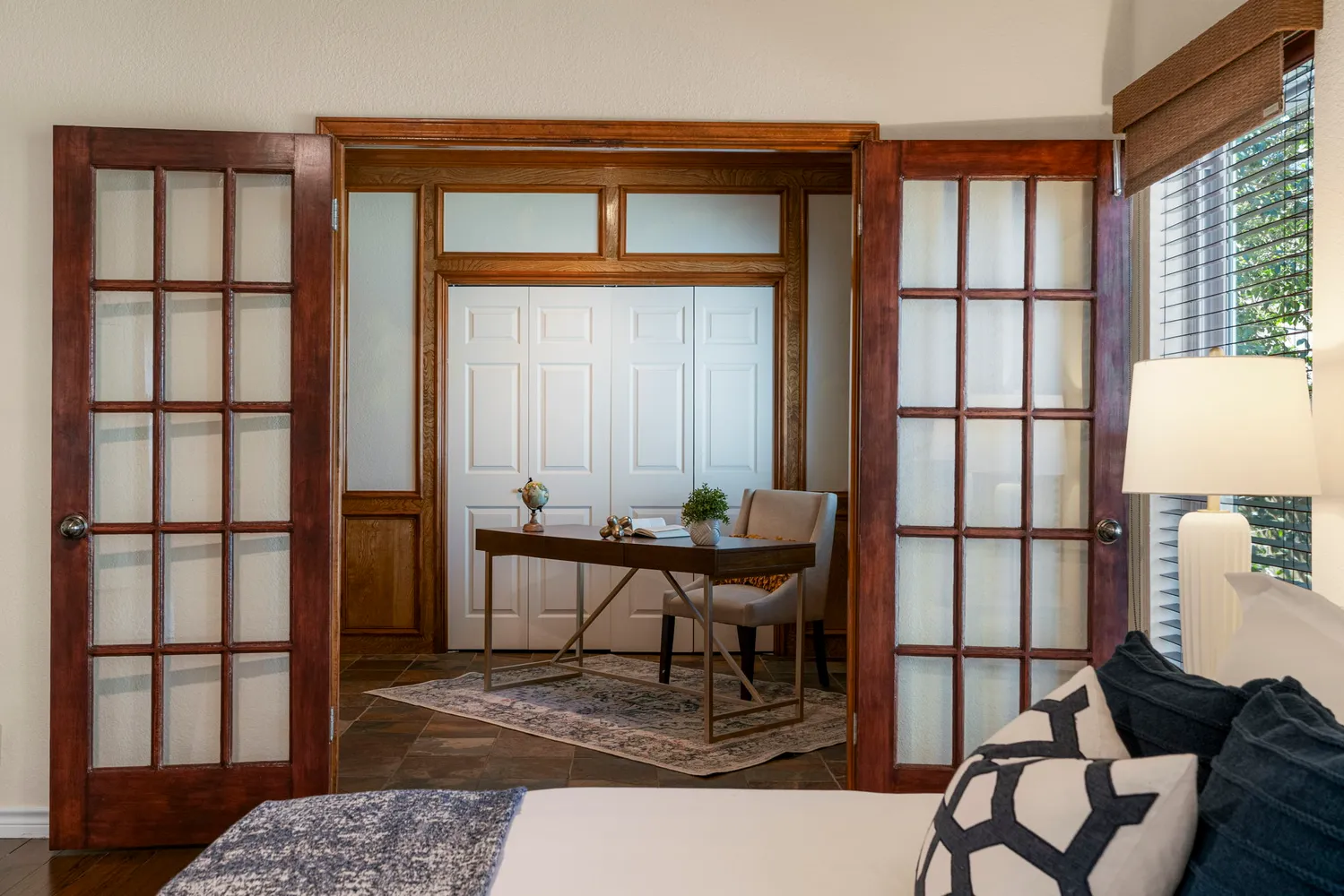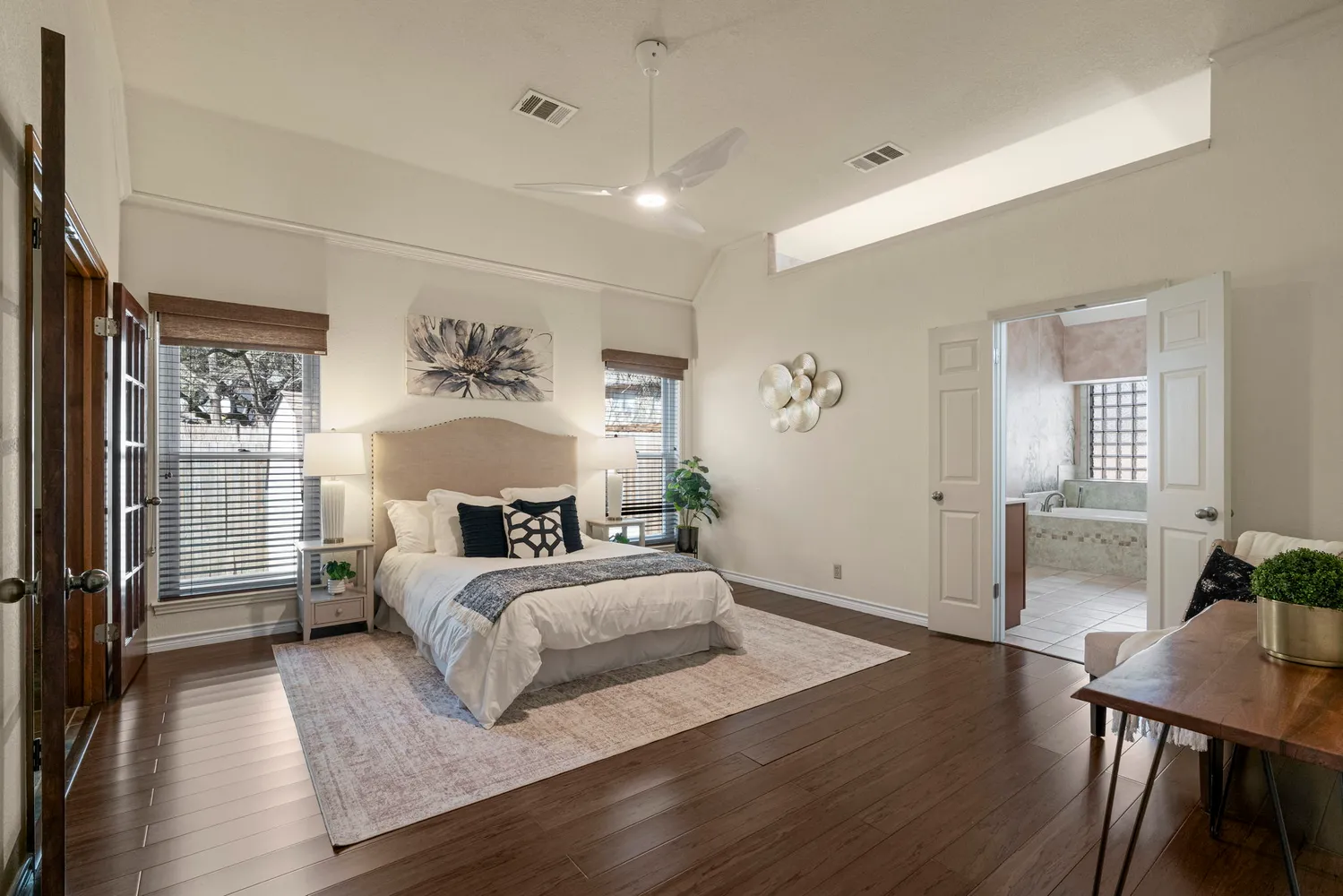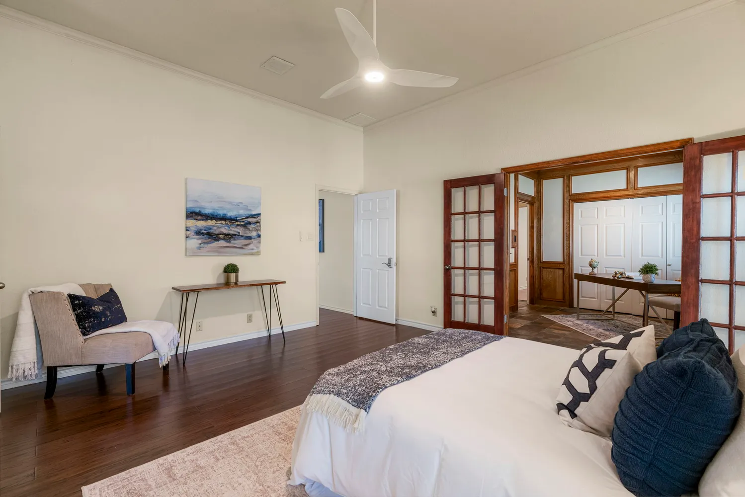 The private primary suite offers dual vanities, a soaking tub, separate walk-in shower, and custom his-and-hers closets. A dedicated study off the primary provides flexible space for a home office, nursery, gym, or sitting area. Two secondary bedrooms offer comfort and privacy for family or guests.