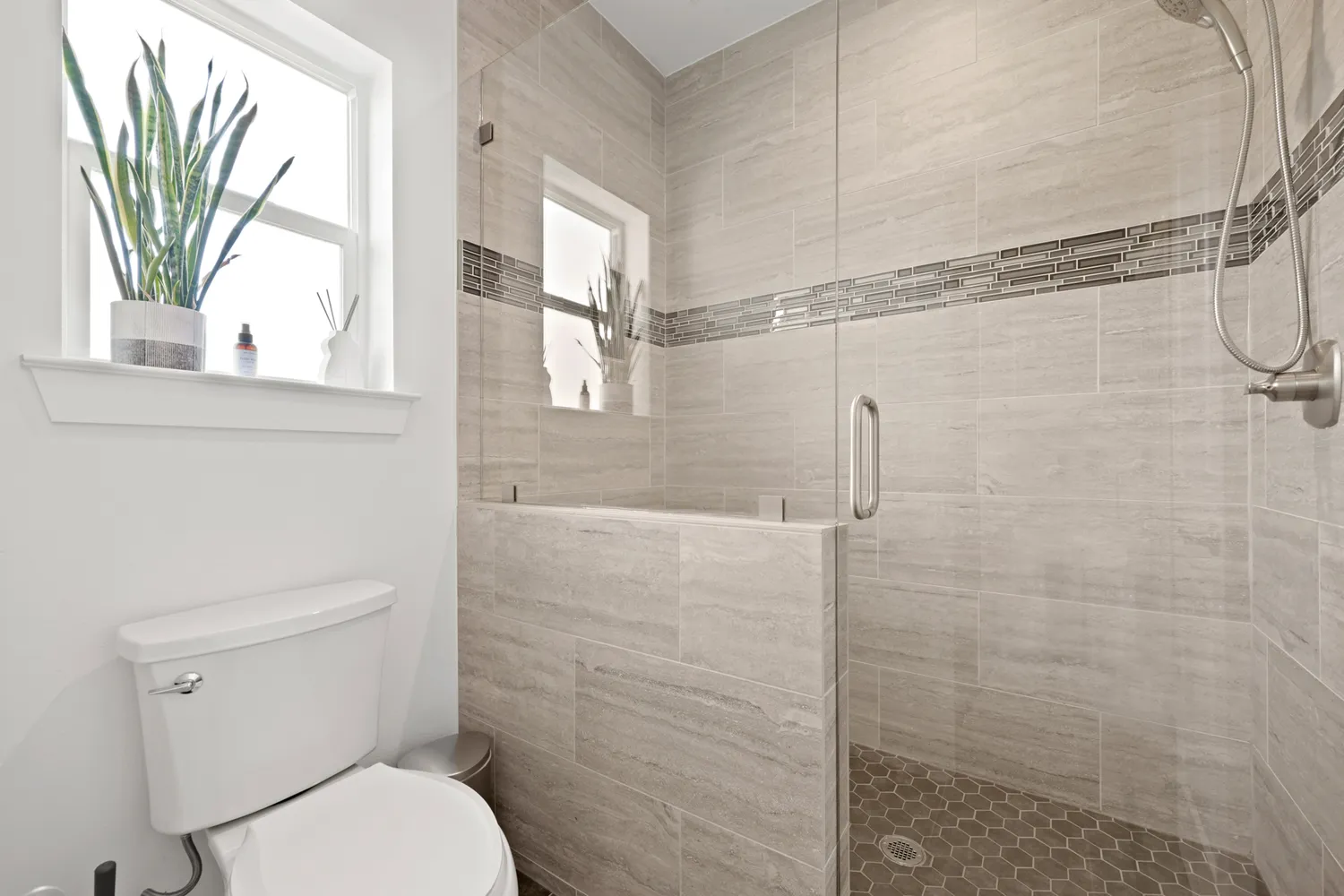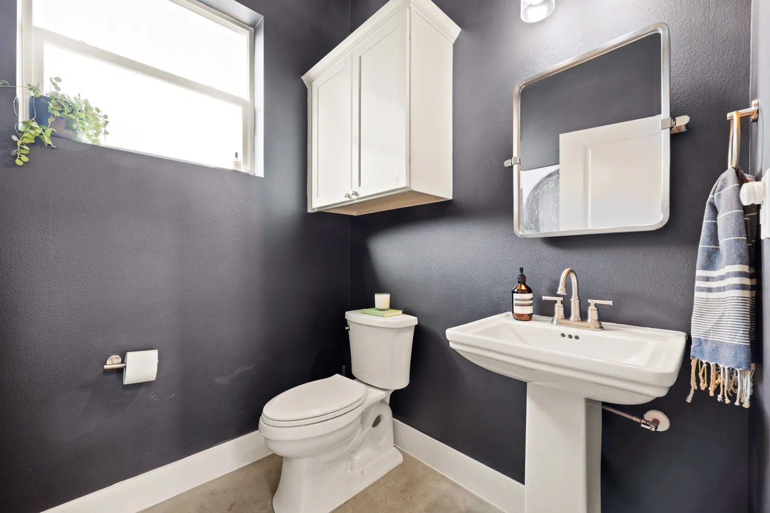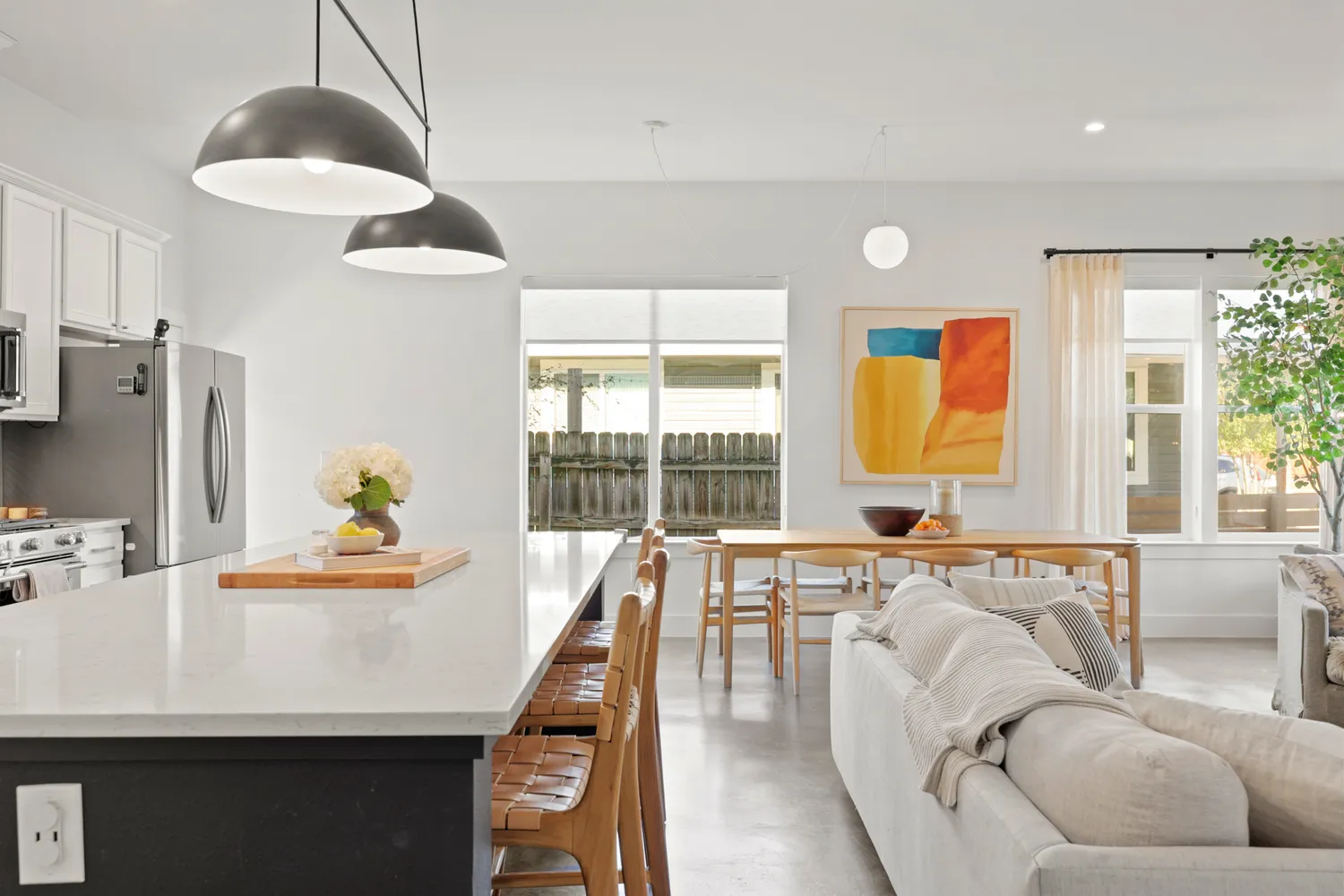 Inside, thoughtful finishes shine: stained concrete floors on the first level, a sleek electric fireplace, quartz countertops, custom cabinetry, and a built-in wine fridge. A full suite of KitchenAid appliances makes the kitchen as functional as it is beautiful.
