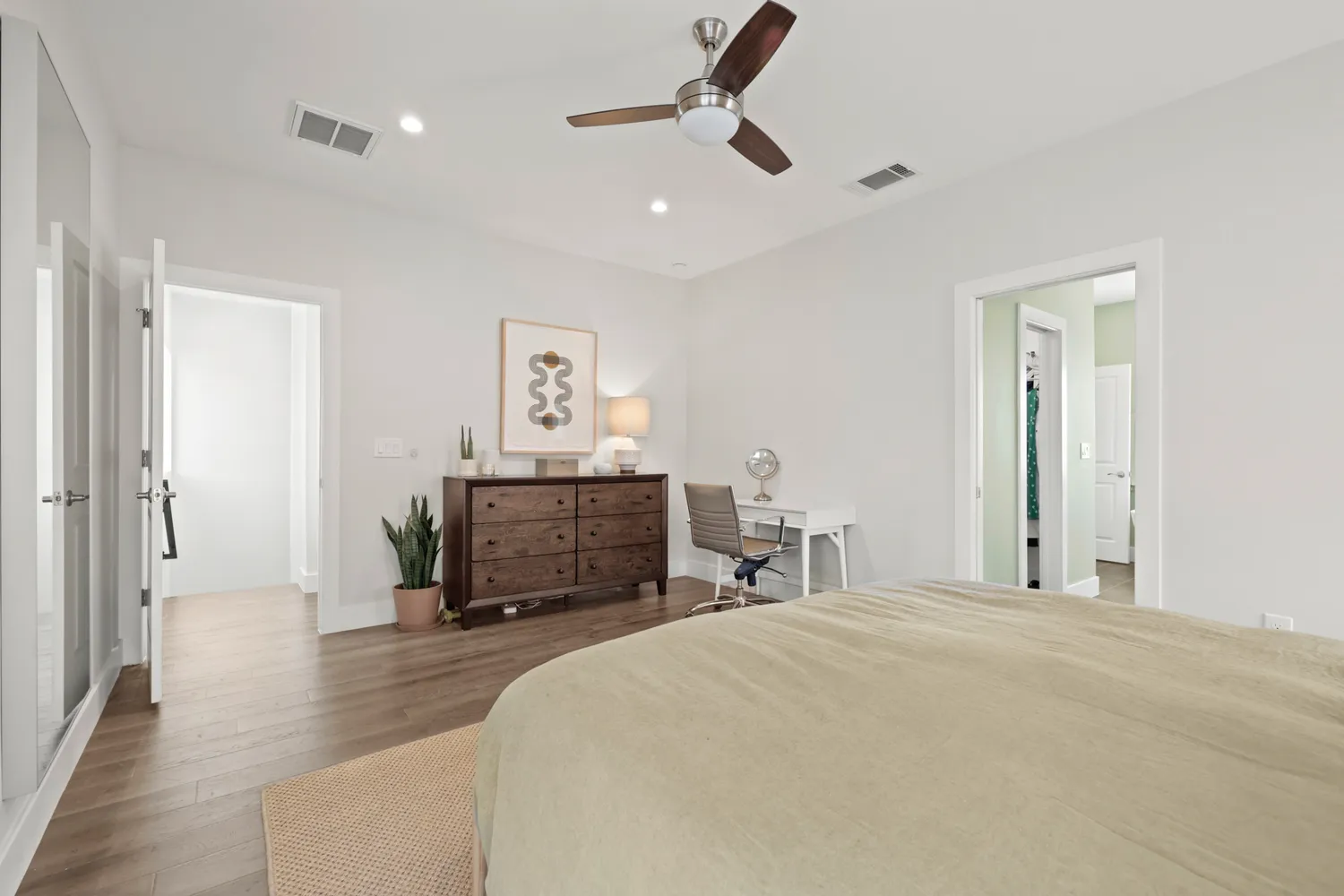The open-concept layout features Texas-sized ceilings throughout further embracing the natural light. Three bedrooms, two and a half baths, and a healthy two-car attached garage offer space that feels intentional and easy. The primary suite...Bathed in morning light, this east-facing new(er) build lives like a true SFR and brings a fresh, effortless feel to East Austin living. At just under 2,100 square feet, the home balances clean architecture with inviting details—modern and cool, but never cold.