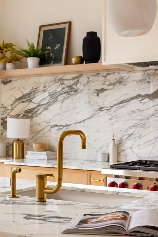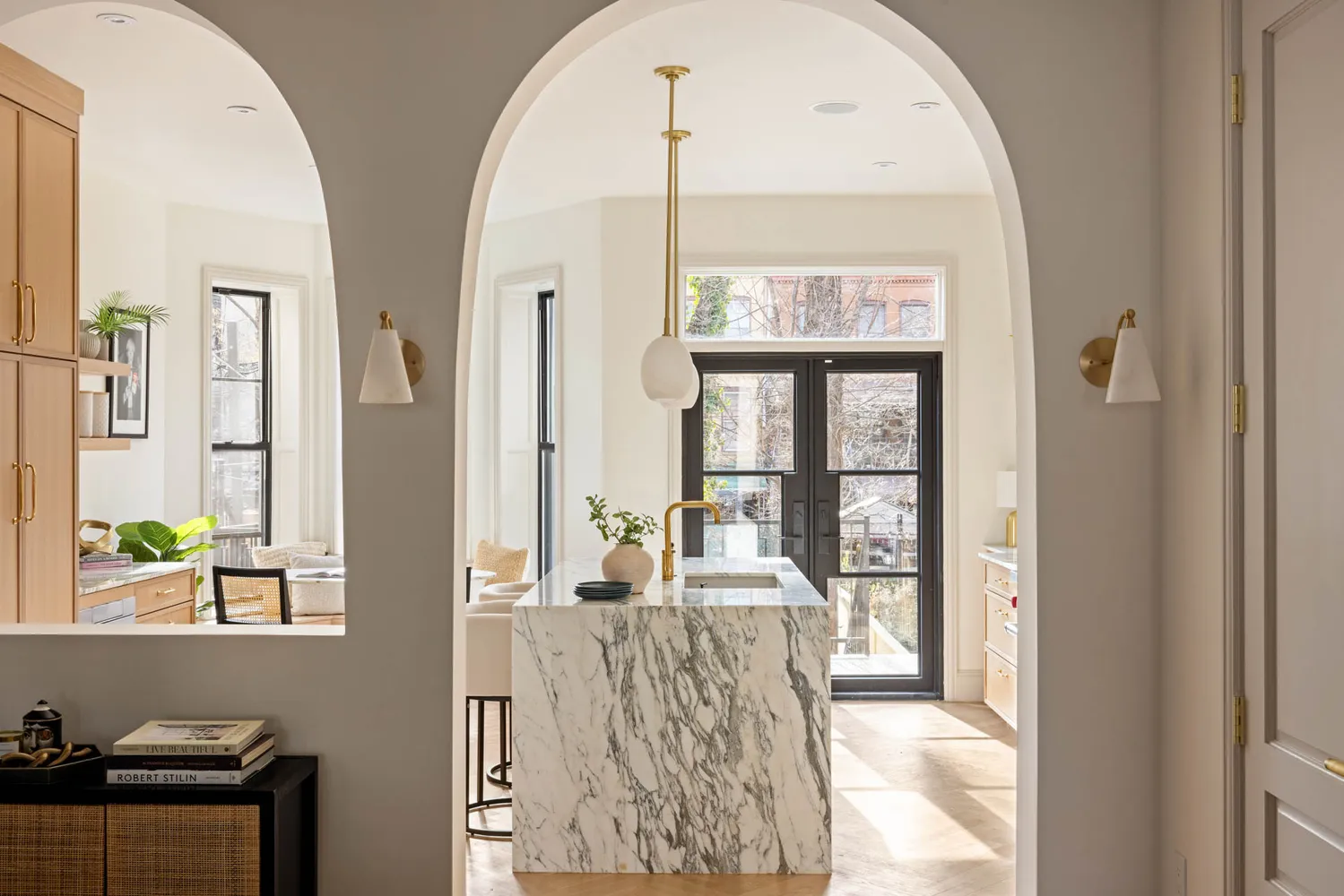The owner’s duplex begins on an inviting parlor level, where high ceilings, tall windows, original details, and exposed brick create a sense of light and openness. A gracious living and dining area flows seamlessly into a thoughtfully designed kitchen with arched walls, featuring ample cabinetry, generous counter space, an eat-in banquette, and premium appliances, including a Wolf range and integrated Fisher & Paykel refrigerator and dishwasher—ideal for both everyday living and large gatherings. Large windows and double glass doors provide direct access to the terrace, effortlessly connecting indoor and outdoor living and making entertaining a breeze.
