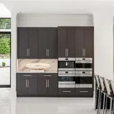The chef’s kitchen is both a design statement and a culinary command center—featuring a massive quartzite island with a 3-inch waterfall edge, full-height slab backsplash, custom flat-panel cabinetry, and a suite of Smeg and Miele appliances including dual wall ovens, steam oven, built-in espresso machine, pot filler, and Miele side-by-side refrigeration. A walk-in pantry, scullery/laundry room, and dry bar with wine fridge add