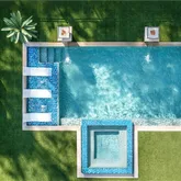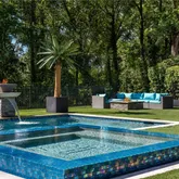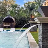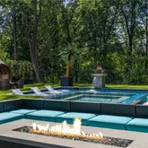 twin waterfall features topped with fire bowls and 12-person hot tub takes center stage, framed by an astroturf backyard, hidden outdoor pool bath, and fire pit lounge.
