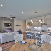 Offering one of the largest floorplans in the community, this home features an open-concept main level with a modern kitchen complete with quartz countertops, stainless steel appliances, natural-gas cooktop, and custom pantry shelving. The living space is anchored by a sleek electric fireplace, and the staircase has been freshly updated with refinished hardwood treads.